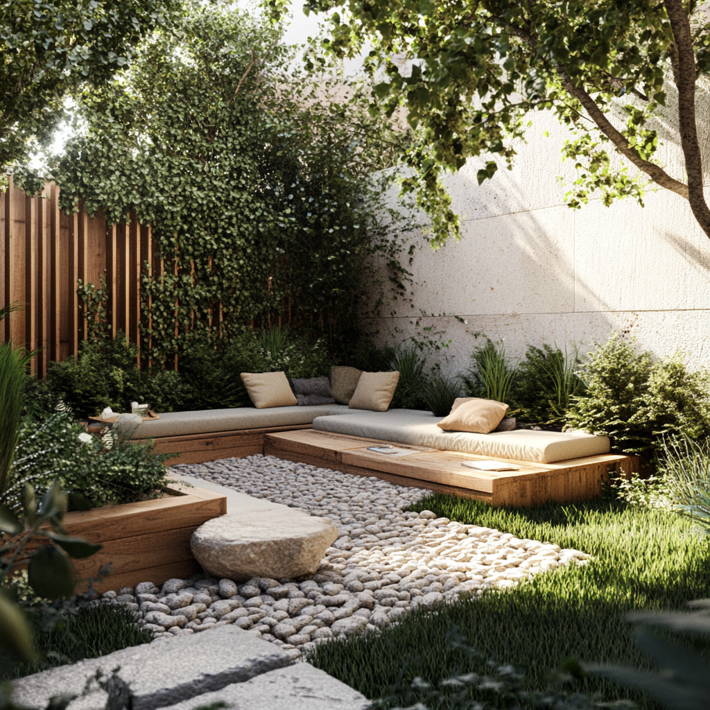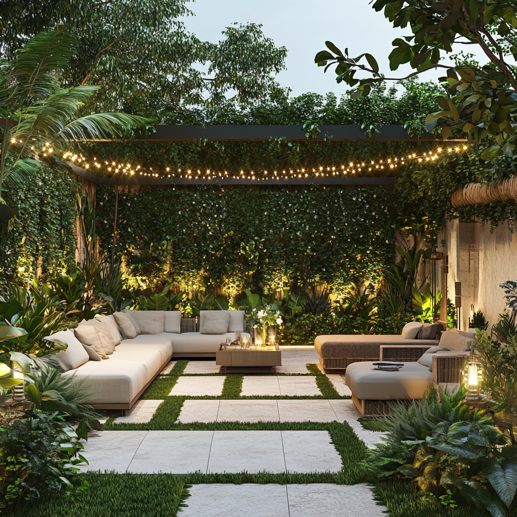 Verwandle einen Teil deines Gartens in eine intime Lounge-Ecke. Nutze Beton Palisaden, um einen abgeschirmten Bereich zu schaffen, den du mit Outdoor-Möbeln und Lichterketten dekorierst.