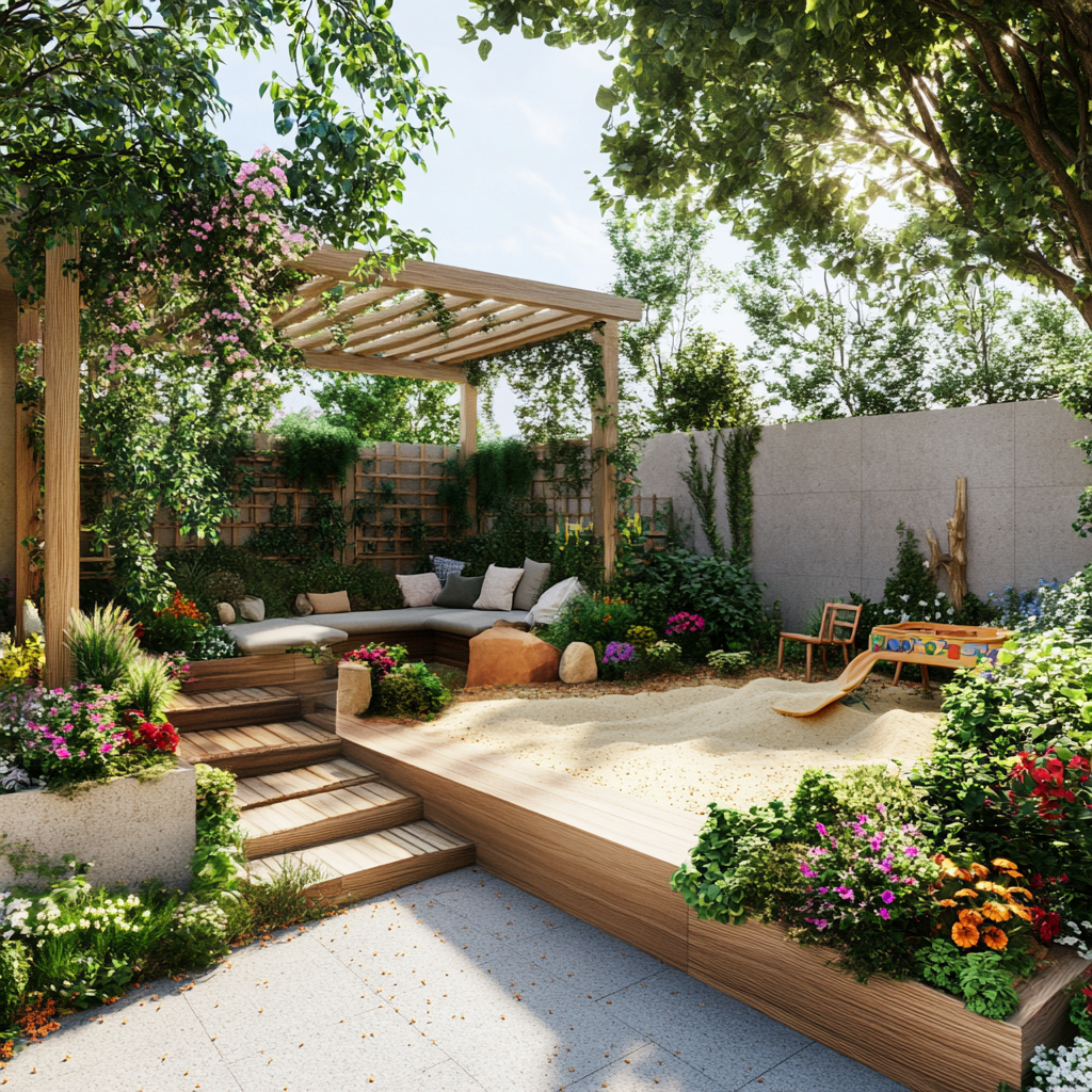 Kombiniere niedrige Granit Palisaden mit erhöhten Pflanzbeeten. Dies verleiht deiner Terrasse nicht nur Struktur, sondern auch Tiefe und Dynamik. - Spielbereich für Kinder: