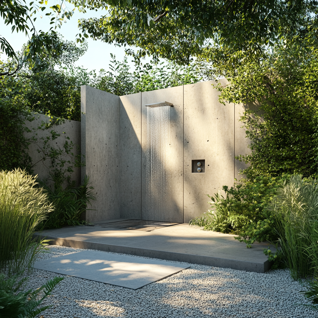 Beispielidee: Nutze hohe Beton-Palisaden, um eine schlichte Outdoor-Dusche im Garten zu gestalten. Ergänze sie mit Kiesboden und Grünpflanzen für eine luxuriöse Atmosphäre.