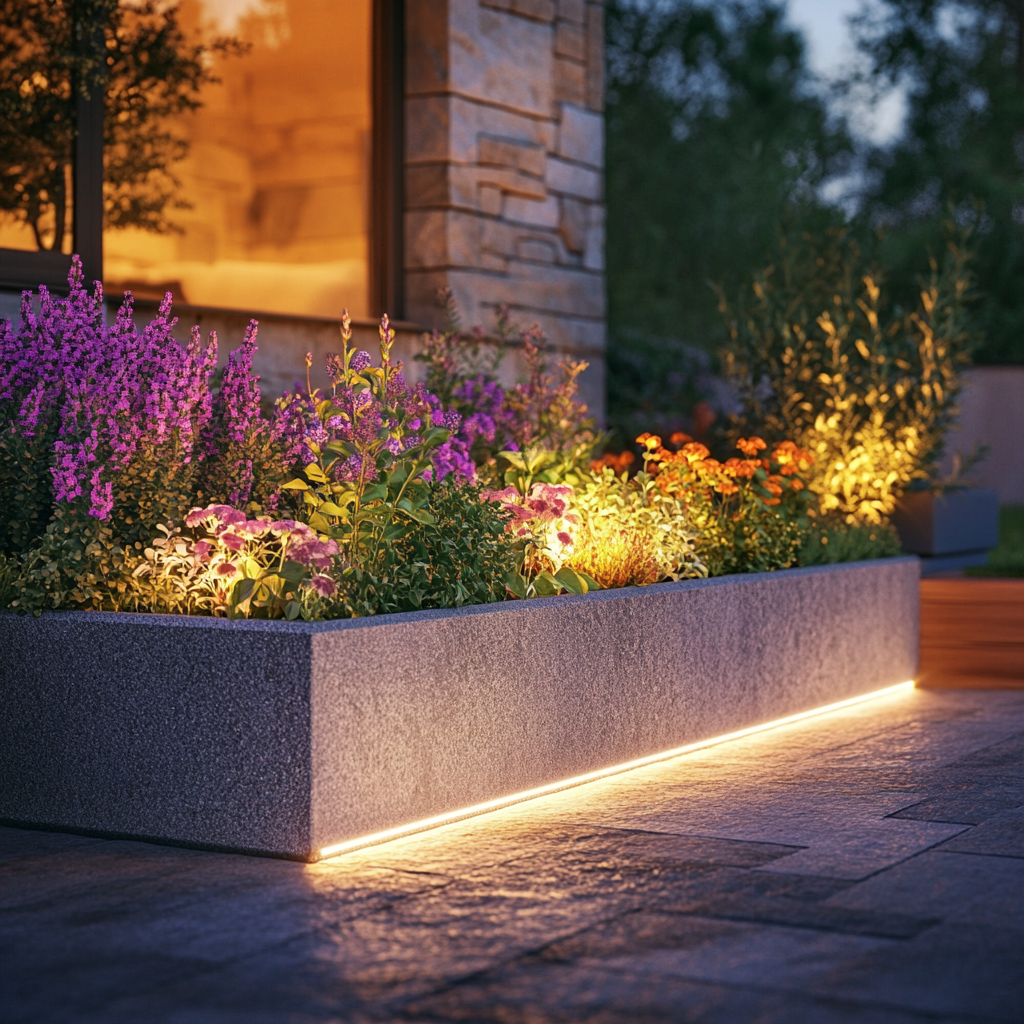 Lasse deinen Garten auch abends strahlen. Ergänze deine Schiefer Palisaden oder Holz Palisaden mit eingebauten LED-Leisten, die die Textur des Materials hervorheben. Diese Kombination sorgt für eine stimmungsvolle Atmosphäre.