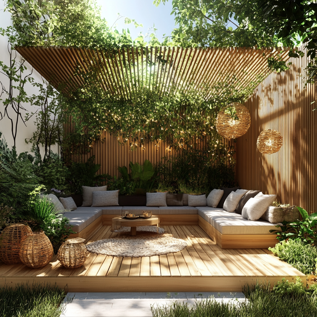 - Lounge-Ecke: Nutze niedrige Holz Palisaden, um eine gemütliche Sitzecke abzugrenzen.
