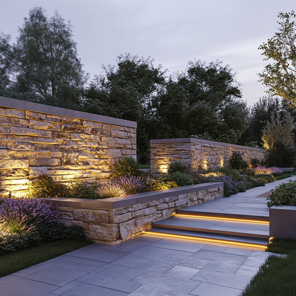 Verwende Materialien wie Granit Palisaden oder Beton Palisaden nicht nur als Schutz, sondern auch als ästhetisches Highlight. Ergänze die Gestaltung mit Beleuchtung für eine stimmungsvolle Atmosphäre.